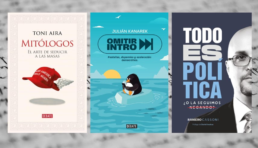 - Mitólogos: El arte de seducir a las masas (Toni Aira, en Debate). Toni rastrea la poderosa herencia de la mitología griega en las narrativas visuales de la política contemporánea. Desde Milei empuñando su motosierra igual que Perseo la cabeza de Medusa hasta la gorra MAGA de Trump que le ha dado las alas del casco de Hermes, pasando por el chándal de Maduro como piel de Hércules. Los relatos antiguos siguen moldeando el inconsciente colectivo. El resultado es un libro sobre los nuevos mitólogos del poder y sobre el arte de escribir la historia con imágenes en un mundo donde mirar ha sustituido a pensar.