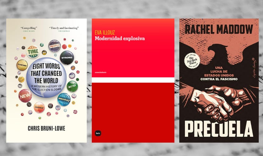 - Modernidad explosiva (Eva Illouz, en Katz editores). ¿Qué papel juegan las emociones en la configuración de nuestro mundo individual y colectivo? La autora analiza cómo la esperanza y la decepción, la nostalgia y el miedo, la vergüenza y el orgullo no son meros estados subjetivos sino fuerzas que modelan la vida social contemporánea.