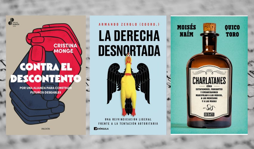 - Contra el descontento: Por una alianza para construir futuros deseables (Cristina Monge, en Paidós). Los malestares sociales que se han ido acumulando durante décadas están cristalizando hoy en un descontento profundo que pone en cuestión los propios fundamentos de la convivencia democrática, la confianza en las instituciones y la idea de futuro. En este contexto, la pregunta se impone: ¿qué podemos hacer?