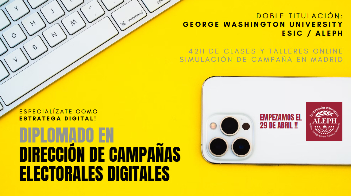 ¿Quieres ser director/a de campañas electorales digitales? Obtén un título por Aleph, ESIC y la George Washington University, con un profesorado formado por Andrés Elías, Gladys Pérez, Aleix Sanmartín, Carles Foguet, Ana Salazar, Yeanine Casco, Àlex Comes, Andrea Ledo, Franz von Bergen, Juan Víctor Izquierdo, Fernando Nieto y Xavier Peytibi. Empieza en abril e incluye una simulación de campaña online. Más información aquí.