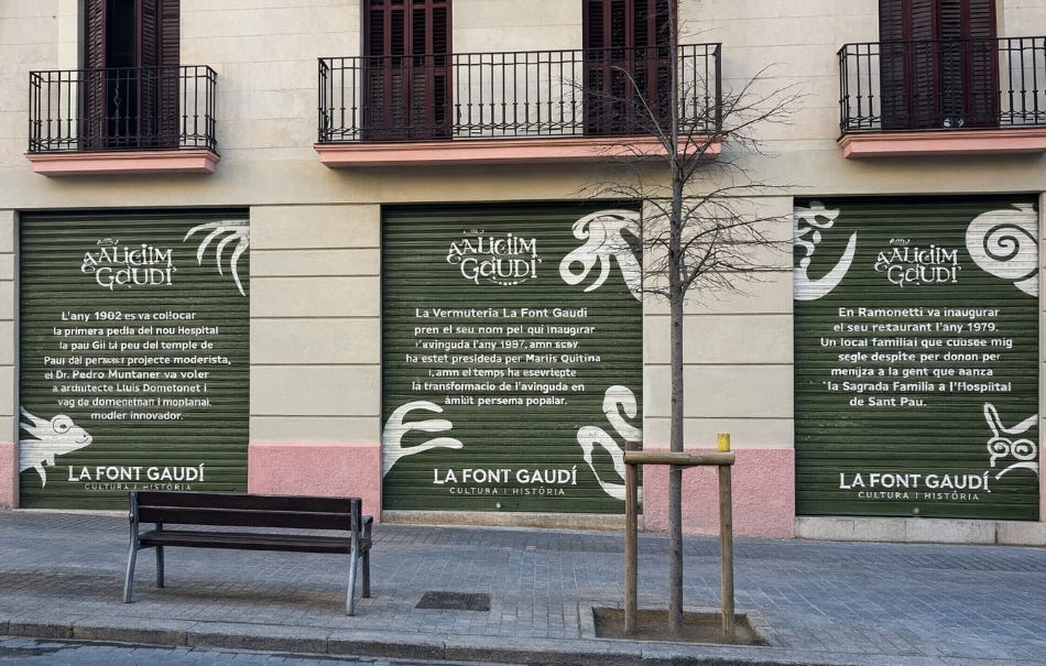 En Barcelona varios establecimientos del eje comercial Gaudí Shopping —en la avenida de Gaudí, entre la Sagrada Família y el Hospital de Sant Pau— han convertido sus persianas en un soporte para contar la historia que hay detrás de cada tienda, bar o restaurante. Bajo la iniciativa “Aquí Gaudim Gaudí”, estos comercios transforman un elemento cotidiano como es su persiana en un altavoz de identidad local (y de su propia historia), con el objetivo de dinamizar la avenida y sus calles adyacentes y reforzar su valor cultural en un entorno de altísima presión turística. Cada persiana combina pequeños fragmentos de texto con ilustraciones inspiradas en los animales presentes en la arquitectura modernista de la ciudad, en una propuesta desarrollada por La Casa de Carlota, un estudio de diseño que trabaja con personas con discapacidad. A partir de las historias de los propios comerciantes, esas persianas funcionan como una especie de archivo abierto del barrio.