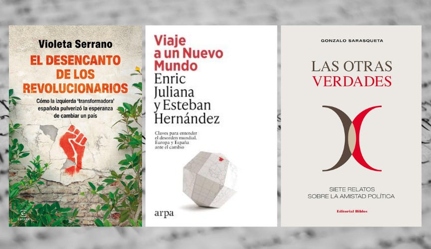 - El desencanto de los revolucionarios (Violeta Serrano, en Espasa). Hoy, la gran ilusión del 15M se ha convertido en humo, dinamitada desde dentro, sumiendo en el desencanto a toda una generación que eligió creer en ella pero descubrió que quienes venían a cambiarlo todo no solo no lograron sus objetivos, sino que dejaron de representar a quienes les habían votado. Tiempo después de aquel episodio, la autora cuenta su experiencia y propone una alternativa inspiradora desde la España olvidada.