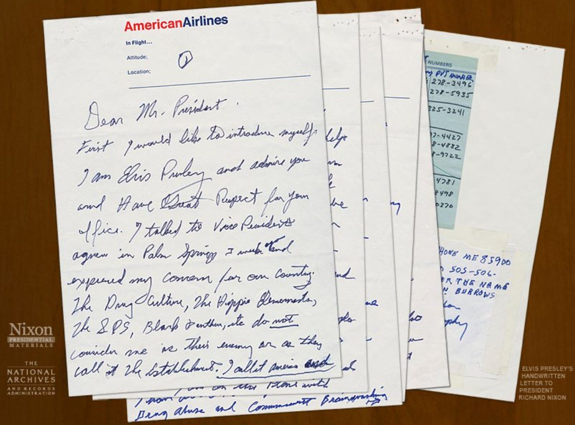 La historia comienza, sorprendentemente, en un avión. El 20 de diciembre de 1970, tras una discusión con su esposa Priscilla y su padre Vernon, Presley abandonó su residencia en Graceland (en Memphis, Tennesee) y voló sin previo aviso a Washington D.C. Durante el vuelo, escribió a mano una carta de cinco páginas dirigida al presidente Nixon. En ella, Elvis se presentaba como “el tipo de persona que puede llegar a los jóvenes”, expresaba su preocupación por el creciente peligro de la droga en la juventud de su país y solicitaba una reunión privada con el presidente para ofrecerse como colaborador en la lucha contra el narcotráfico y el comunismo (sí, las dos cosas). Lo más increíble de esta carta es que Presley, quien había escrito solo cuatro cartas en toda su vida, decidió que esta misiva debía entregarla en mano. Al llegar a Washington se dirigió personalmente a la Casa Blanca, donde habló con uno de los agentes del Servicio Secreto en la entrada principal y le dejó la carta con una foto como prueba de identidad. Después, se registró en un hotel y esperó.