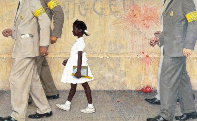 El cuadro representa a Ruby Bridges, una niña afroamericana de seis años, de camino a la escuela William Frantz Elementary School de Nueva Orleans el 14 de noviembre de 1960, durante la crisis de desegregación escolar. Ante las amenazas de violencia contra ella, la escoltan cuatro agentes federales.