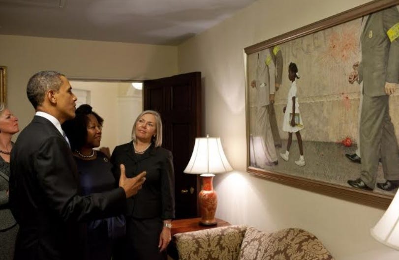 La historia tiene un capítulo final que me parece extraordinario. En 2011, el presidente Barack Obama colgó el cuadro en un pasillo junto al Despacho Oval. Cuando él y Ruby Bridges lo contemplaron juntos, Obama le dijo: “Creo que es justo decir que si no hubiera sido por ustedes, puede que yo no estuviera aquí y no estaríamos mirando esto juntos”.