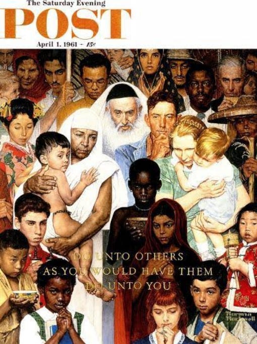 El primer indicio público de su transformación fue un cuadro llamado Golden Rule (1961), publicado todavía en el Saturday Evening Post: un mosaico de rostros de diferentes culturas del mundo. Era un gesto amable, casi prudente. Una representación de muchas formas distintas de vivir la fe. Un ensayo general, podría decirse, antes del salto al vacío que vendría dos años después.