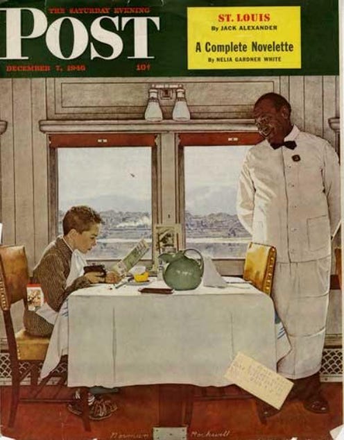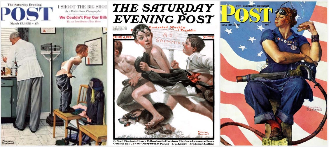 Desde los años 30, el trabajo de Rockwell para el Saturday Evening Post, con sus soda jerks y sus boy scouts, presentaba una visión idílica de un país que, en realidad, apenas existía tal y como él lo retrataba. Era un mundo bello, ordenado y casi uniformemente blanco. No se trataba de una elección estética: era una política editorial.